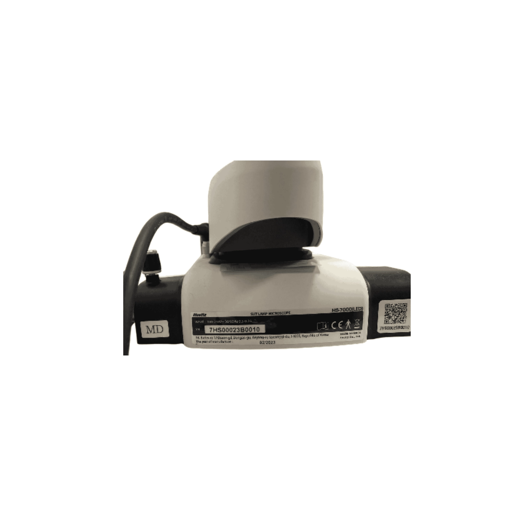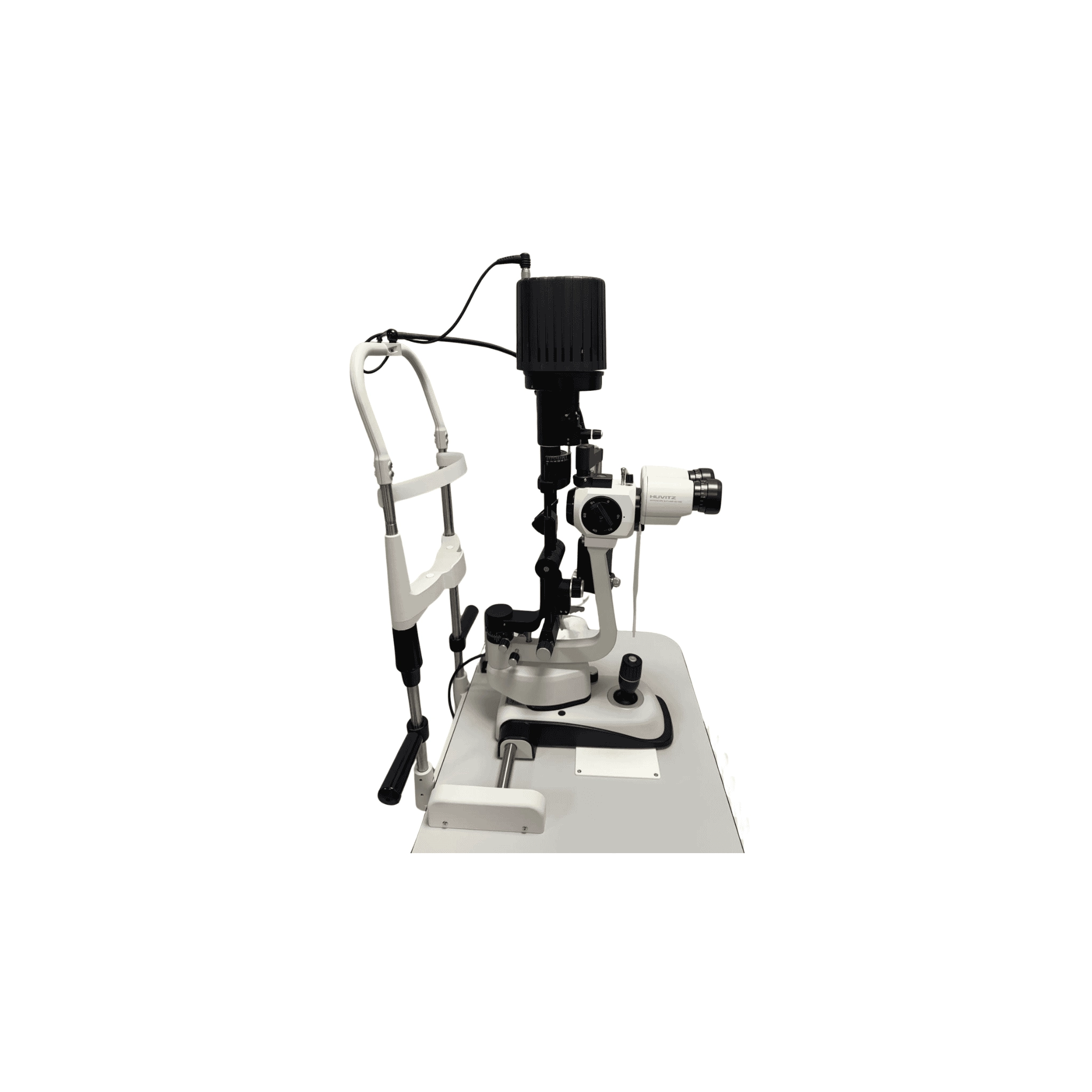Lámpara de rendija LED Huvitz HS-7000 del año 2023 con iluminación LED, que se vende con mesa, mentonera, guías y cubiertas para las guías.